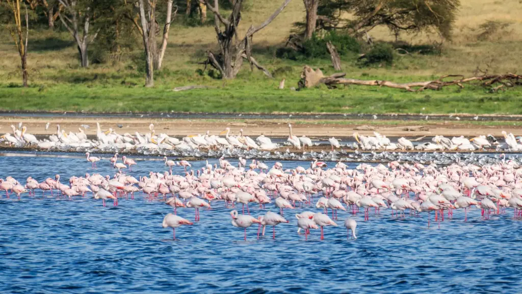 Three soda lakes, Nakuru, Bogoria, and Elementaita, together support roughly 75% of the global lesser flamingo population. When conditions are right, the density of birds turns the entire shoreline pink. You can see it from kilometres away. All three lakes are part of a single UNESCO World Heritage Site.