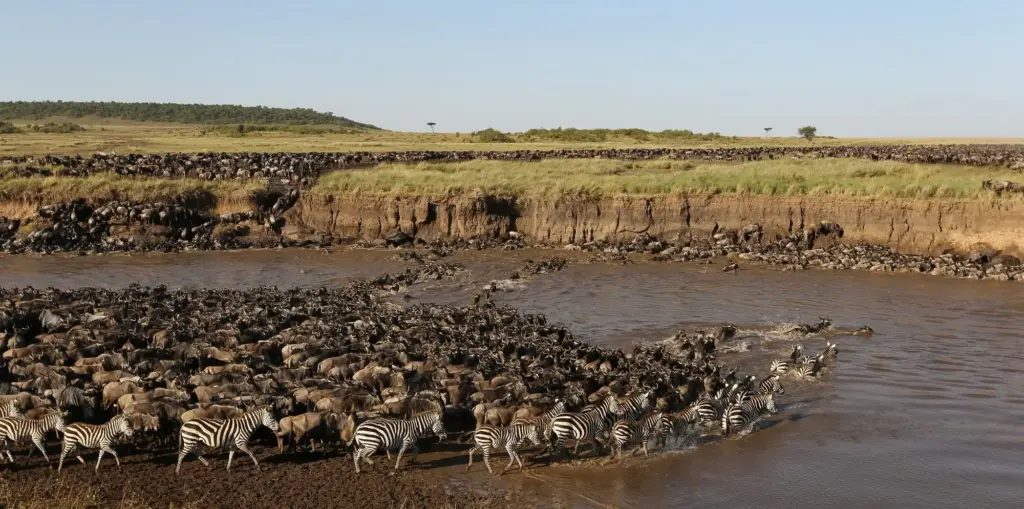 The Mara River crossing is the moment everyone comes for. Thousands of wildebeest hurl themselves into fast-moving water where more than 3,000 Nile crocodiles are waiting. It sounds brutal, and it is. It is also one of the most spectacular things a human being can witness. The best window is July through October.